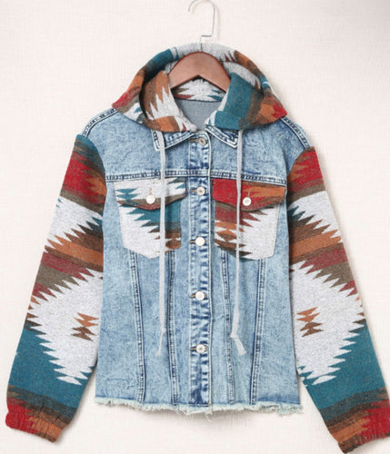 Aztec Print Frayed Denim Jacket (S-XL)