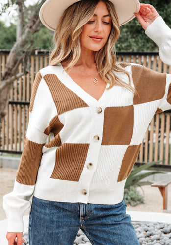 Brown and White Checkered Pattern Ribbed Button V Neck Cardigan (S-XL)