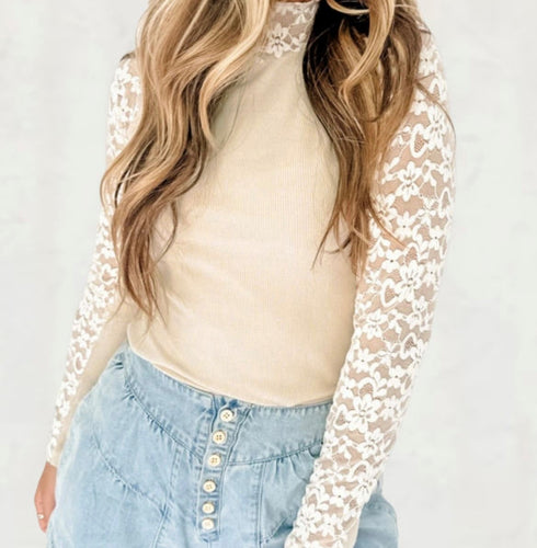 Beige Floral Lace Long Sleeve High Neck Top (S-XL)