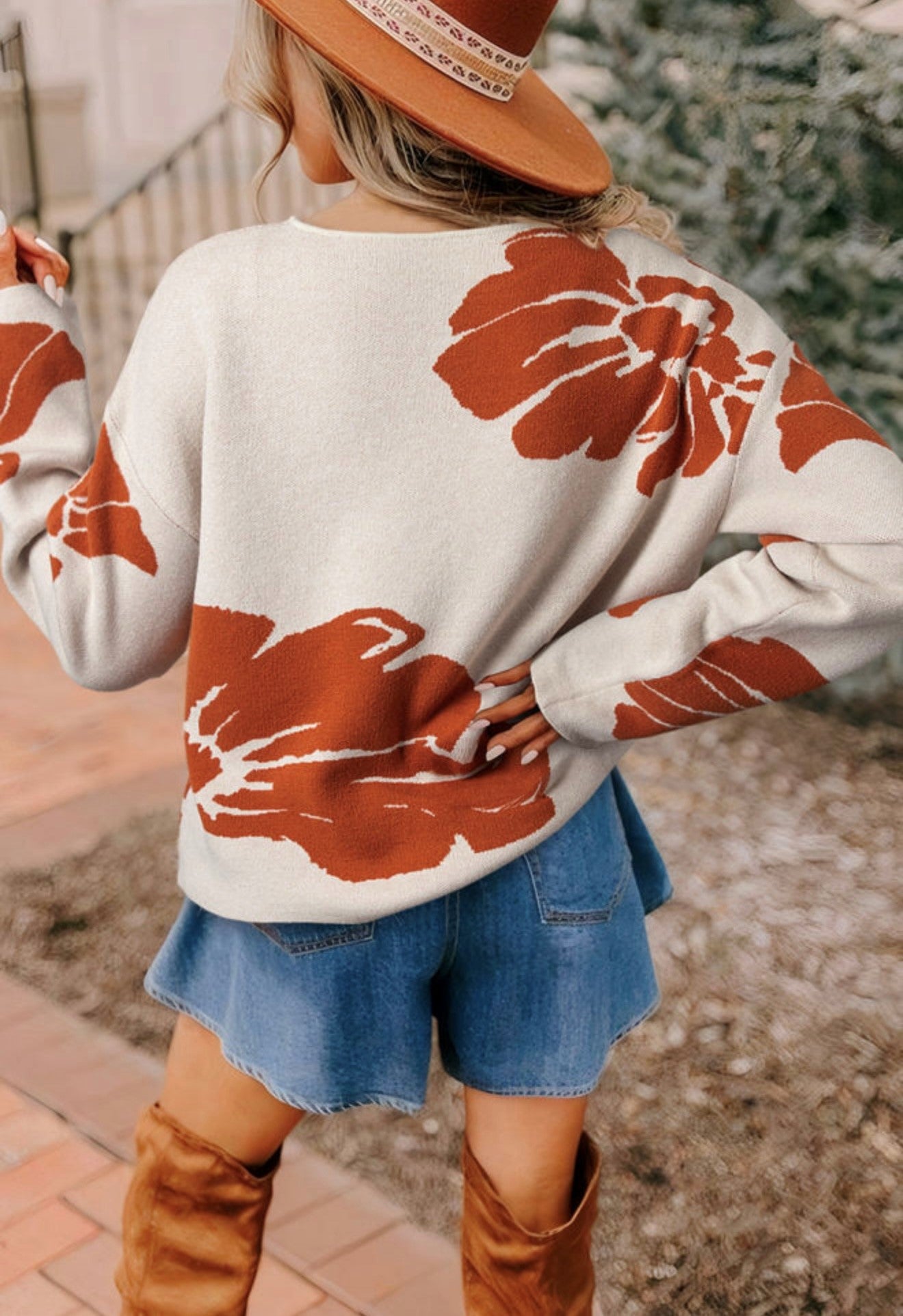 Beige Bold Flower Pattern Wide Sleeve Sweater (S-XL)